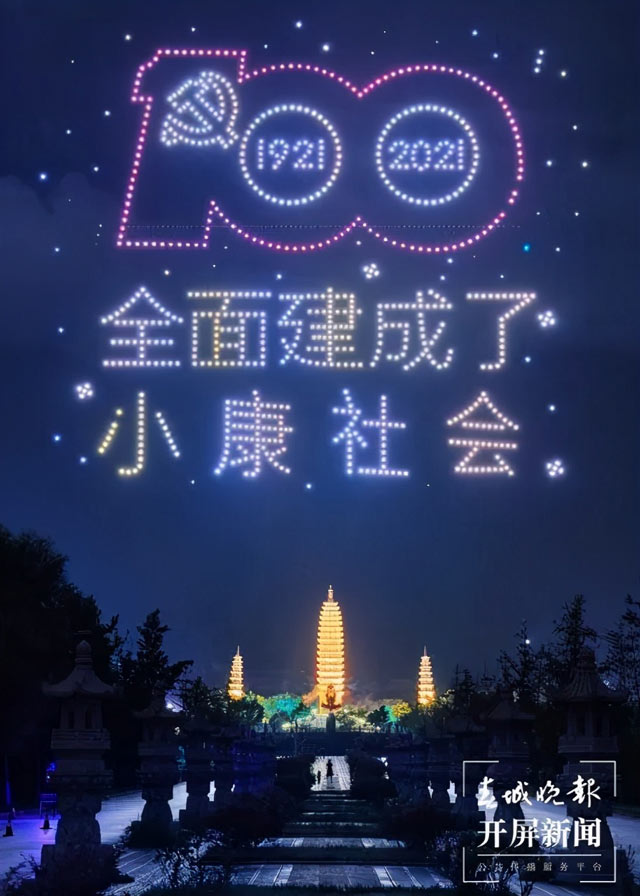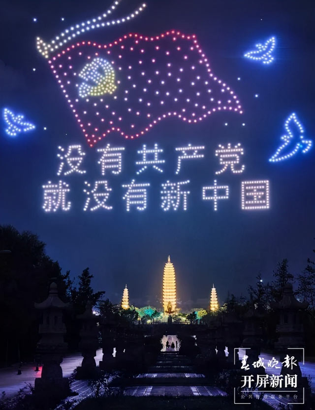 7月9日晚,大理州庆祝建党100周年无人机表演在大理崇圣寺三塔正式举行。活动开始后,无人机起飞,点亮夜空,观众们兴奋地挥舞着国旗,感受强盛祖国带来的自豪感。