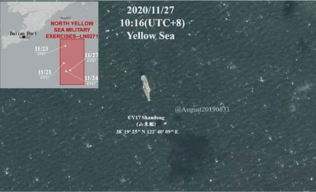 自2019年11月17日服役以来,山东舰已从军一年,母港为三亚海军基地。然而这一年来,它大部分时间依然待在北方,甚至是造船厂里,甲板上也没有满载歼15。最近,山东舰终于又出海了,据媒体报道,它正在黄海海域展开服役后的国家试验和训练工作,而一些西方国家的卫星,和往常一样,又纷纷盯上了这一海域,比如在11月27日,美国行星实验室的卫星就拍到了山东舰在海上试航的清晰画面。