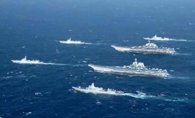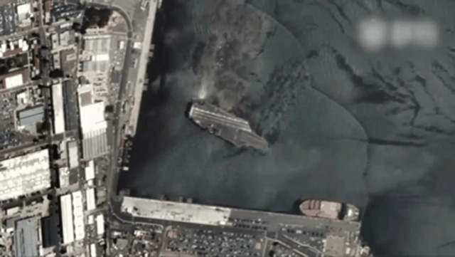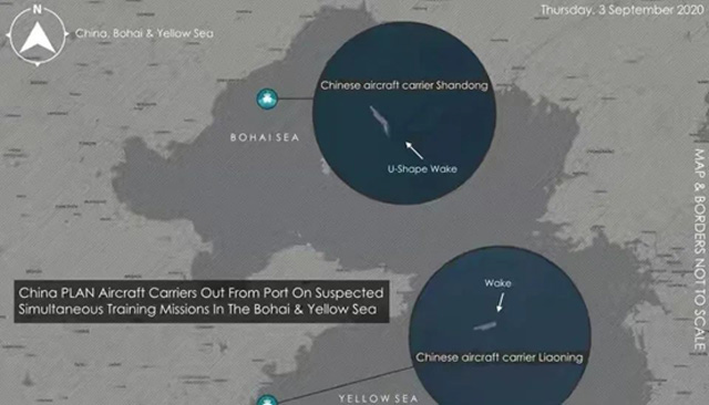 外国卫星拍摄辽宁舰山东舰同时出海的画面