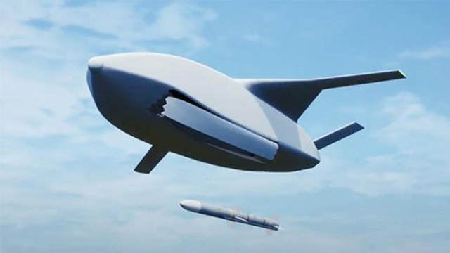 “天空博格人”自主可消耗无人机从内埋弹舱投射AIM-120空空导弹想象图(美空军图片)