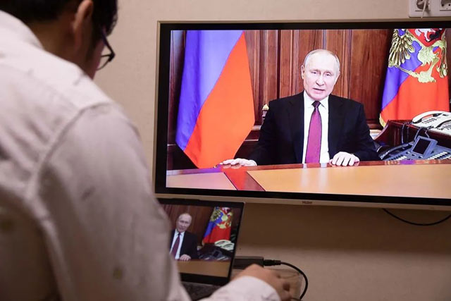 ▲2月24日,俄罗斯首都莫斯科,记者观看普京发表讲话的电视画面。普京在讲话中宣布在顿巴斯地区发起特别军事行动。图/新华社