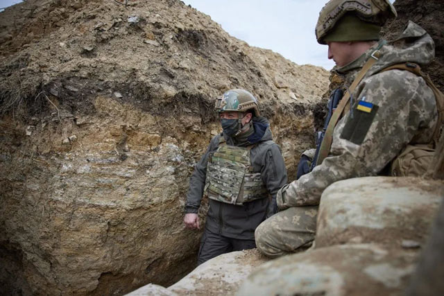 ▲2021年4月8日,乌克兰总统泽连斯基在顿巴斯地区乌政府军阵地视察。图/新华社