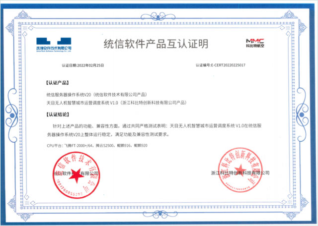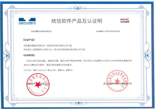 今年二月,科比特天目将无人机智慧城市运营调度系统、科比特无人机调度中心系统V1.0两项产品与统信软件技术有限公司完成兼容性测试获统信软件认证。