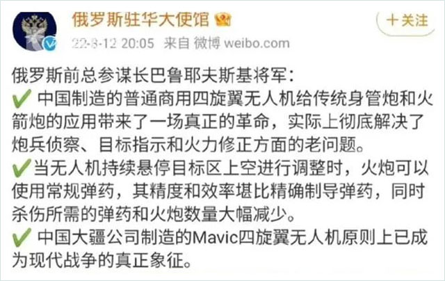 俄驻华大使馆发文称,俄前总参谋长盛赞大疆四轴无人机给身管火炮和火箭炮的作战带来革命,成为现代化战争的象征。对此,大疆表示所有产品均为民营目的设计,不适合也不满足军事用途需求,也不支持一切军事领域应用。