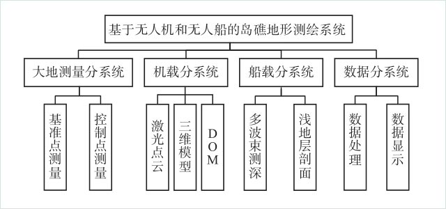 基于无人机和无人船的岛礁地形测绘系统由大地测量分系统、机载分系统、船载分系统以及数据分系统组成。各分系统见图1。