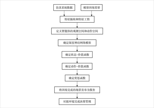 根据仿真系统中的数据和模型训练效果的需要,进行特征抽取和特征工程,定义强化学习智能体的观测空间和动作空间,如果强化学习的环境是完全可观测的,则观测空间实际上就是智能体的状态空间;如果智能体不能完整并准确地观测到自身所处状态,则决策管理问题从完全可观测问题转化为部分可观测问题。此时,需要考虑观测函数,用于决定智能体所处状态的观测情况。将智能体用以决定如何采取动作的机制表示为由参数确定的深度神经网络模型,智能体按照策略与环境交互过程中产生状态- 动作序列,将智能体获得的累积奖励表示为状态- 价值函数,将执行动作之后智能体获得的累积奖励表示为动作- 价值函数。通过智能体与环境交互产生数据,根据这些数据学习智能体的策略,设计相应的奖惩函数,让训练完成的智能体按照已经学习的策略与环境交互。具体过程见图1。