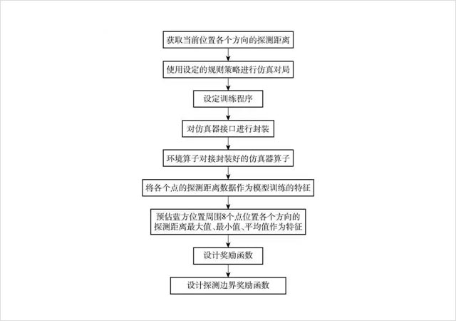 根据所在位置的经纬度获取当前位置各个方向的探测距离。在仿真平台使用设定的规则策略进行仿真对局。在强化学习平台配合仿真平台设定训练程序,如果获取到的是重复的状态信息,则不执行动作,直至获取到不同的状态信息。由于仿真平台更新状态信息时间并不固定,训练程序间隔固定时间获取到的状态无法确定是否为更新后的,因此获取状态信息等待方式以状态是否更改为标准。使用自定义仿真器,对仿真器接口进行封装,使其在强化学习平台上以一个算子的形式进行对接。使用自定义环境算子对接封装好的仿真器算子,在算子中调用仿真器的接口进行信息交互。在强化学习训练算子中启用自定义模型来控制智能体的动作。将各个点的探测距离数据作为模型训练的特征,进行模型训练。在红方发现蓝方后,预估蓝方位置周围8个点位置各个方向的探测距离最大值、最小值、平均值作为特征。强化学习通过与环境交互习得任务的决策策略,具有自学习和在线学习的特点,在需要感知高维度输入数据和决策管理的探测任务中应用强化学习时,这种交互试错机制会导致算法的运行效率太低,收敛速度比较慢,由于没有明确的监督信号,强化学习的学习速度会很慢,此时智能无人系统需要在与环境交互时依靠奖励信号来调整动作。在强化学习平台设计奖励函数,计算当前实际距离和预估的探测距离,根据距离进行相关的奖励和惩罚。设计边界奖励函数,如果在边界范围(边界范围包括探测深度)内,即使距离边界很近,只要不出边界就不进行惩罚,出了边界,距离越远惩罚越大,按照指数递增的方式加大惩罚值。