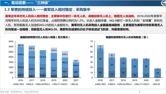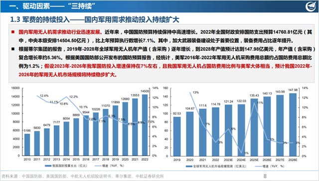 美军近年来对无人机投入相对稳定,主要集中在察打一体无人机、战略侦察无人机上、舰载无人加油机。2016-2022年美军平均每年对无人机投入约为30亿美金,占国防预算比例约为1.2%。从投入金额来看,MQ-9察打一体无人机和“全球鹰”系列无人机、新型舰载无人加油机MQ-25的投入金额较大。美军对无人机采购投入金额呈缩减趋势,主要是因为美军对传统军用无人机列装成一定规模,而新型无人机MQ-25、蜂群和忠诚僚机仍处于研发或试飞阶段,列装需要时间。国内军用无人机需求推动行业迅速发展。近年来,中国国防预算持续保持中高速增长。2022年全国财政安排国防支出预算14760.81亿元(其中,中央本级安排14504.50亿元),比上年预算执行数增长7.1%。其中,加大武器装备建设处于首要位置,装备费用占比逐年提升。
