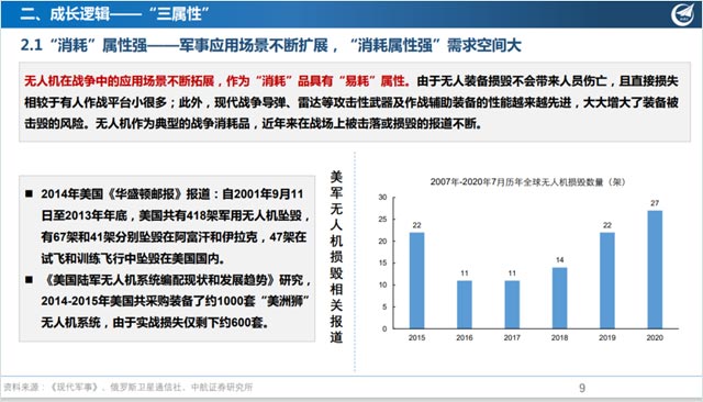 无人机在战争中的应用场景不断拓展,作为“消耗”品具有“易耗”属性。由于无人装备损毁不会带来人员伤亡,且直接损失 相较于有人作战平台小很多;此外,现代战争导弹、雷达等攻击性武器及作战辅助装备的性能越来越先进,大大增大了装备被 击毁的风险。无人机作为典型的战争消耗品,近年来在战场上被击落或损毁的报道不断。