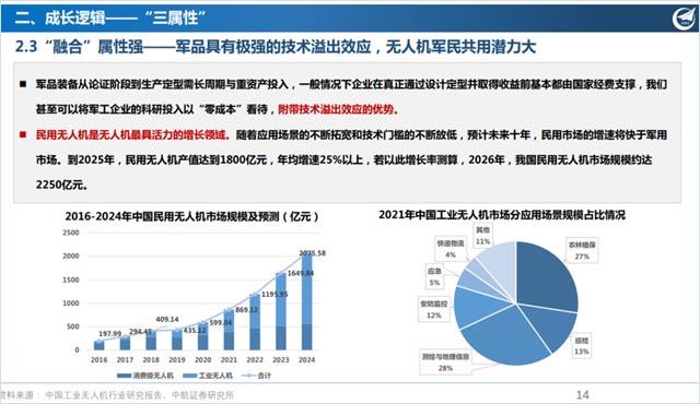 军品装备从论证阶段到生产定型需长周期与重资产投入,一般情况下企业在真正通过设计定型并取得收益前基本都由国家经费支撑,我们甚至可以将军工企业的科研投入以“零成本”看待,附带技术溢出效应的优势。民用无人机是无人机最具活力的增长领域。随着应用场景的不断拓宽和技术门槛的不断放低,预计未来十年,民用市场的增速将快于军用市场。到2025年,民用无人机产值达到1800亿元,年均增速25%以上,若以此增长率测算,2026年,我国民用无人机市场规模约达 2250亿元。