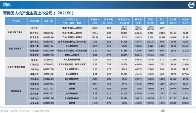 目前国内知名的军用无人机系统集成商有航空工业集团、航天科技集团、航天科工以及北航、 西工大等军工集团、军工院校、民参军企业。其中,“翼龙”系列生产商中航(成都)无人机公司、“彩虹”系列生产商航天彩虹、“长鹰” 系列生产商北航天宇长鹰主要生产中大型长航时无人机。航天电子、南京模拟技术研究所、航天科工302所、西工大爱生集团以及威海广泰等,其无人机生产规模大、技术先进,是国内中小型军用无人机的领军企业。按收入规模和技术水平来划分:发展速度最快、装备性能先进,营业收入体量大的中航无人机(2021年收入24.8亿)、航天彩虹( 2021年无人机收入11.2亿)、航天电子( 2021年无人机收入7.8亿)为第一梯队;装备性能先进,营业收入体量较大的天宇长鹰、西工大爱生、海鹰航空、南京模拟所第二梯队;生产靶机或小型无人机、且体量较大的民参军上市企业纵横股份、威海广泰、星网宇达为第三梯队。