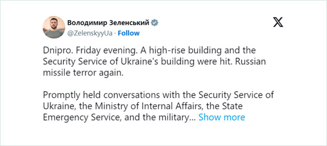 泽连斯基表示,对于上述袭击事件,他已与乌国家安全局、内务部、紧急情况部门以及第聂伯罗彼得罗夫斯克州军事行政管理部门负责人谢尔盖•雷萨科交谈,有关部门正在现场开展工作。泽连斯基还称,“我们将尽全力让俄罗斯因其侵略行为和针对我们民众的恐怖主义行为得到惩罚”。