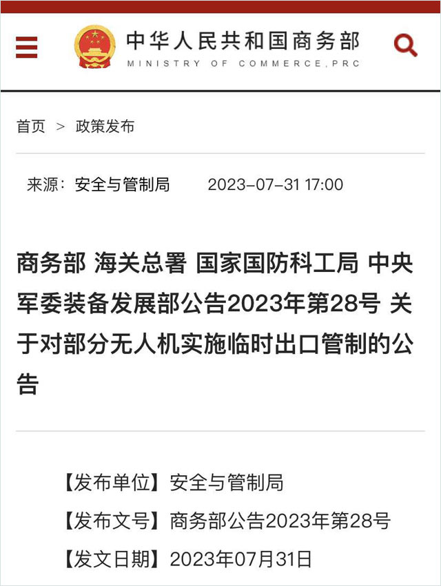 当天,商务部新闻发言人就无人机临时出口管制政策答记者问时表示,高性能无人机具有一定军用属性,对其实施出口管制是国际惯例。2002年起,中国逐步对无人机实施出口管制,管制范围、技术标准与国际保持一致。