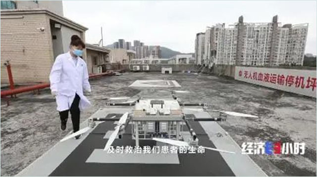 深圳市宝安区中心血站,工作人员接到一家医院的用血请求,迅速准备血液,3分钟之内就从血站起飞,30公里的路程,车程至少两小时,用无人机半个小时就可以送到。