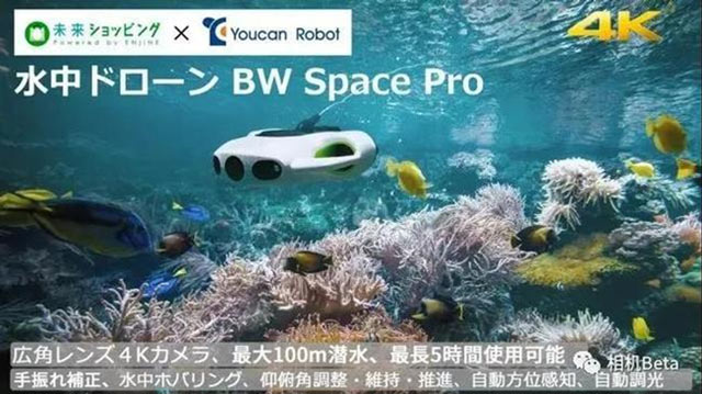 日本公司 Youcan Robot 推出的两款 BW Space Pro 水下无人机,可下潜最深 100 米的水域进行拍摄,使用时间最长 5 小时,并有配备变焦镜头的版本。