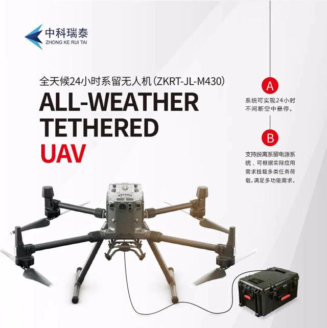 中科瑞泰配套M300系留系列产品,在55分钟长航时基础上再升级全天候超长续航,破解行业无人机超长驻空并执行多任务应用痛点,降低对人力的需求、对技能的依赖。